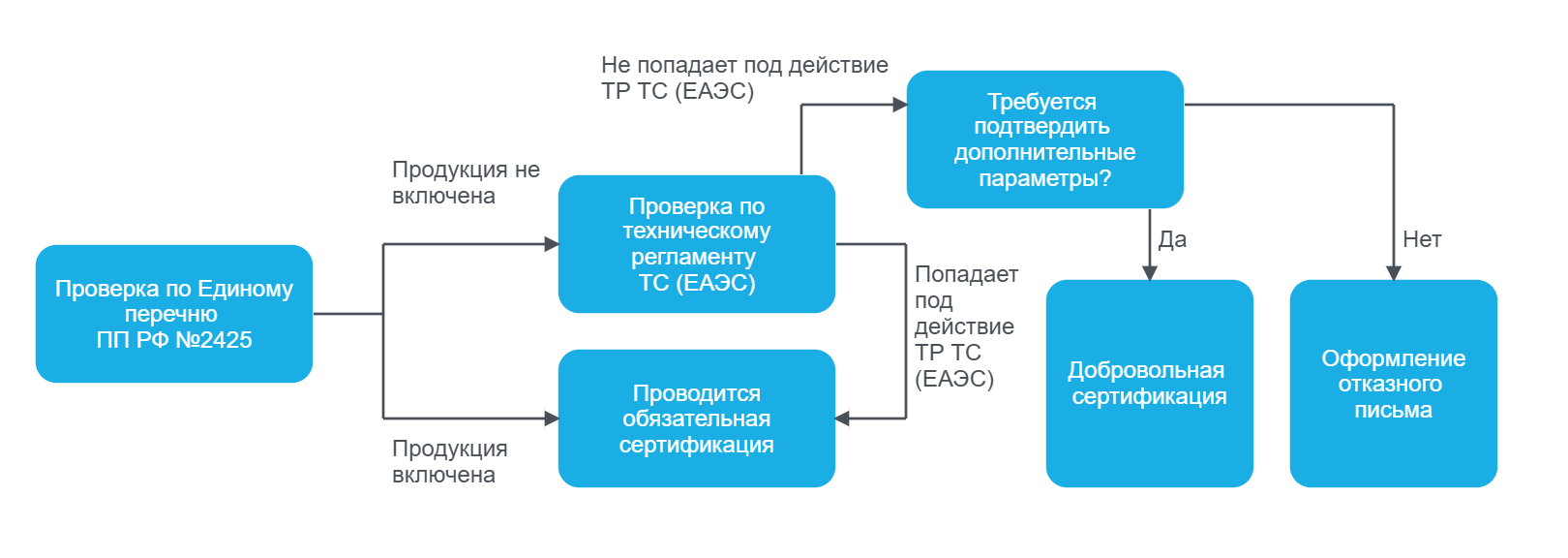 | Продукция входит в перечень ПП РФ №2425 | Обязательная сертификация/декларирование | Требование законодательства |