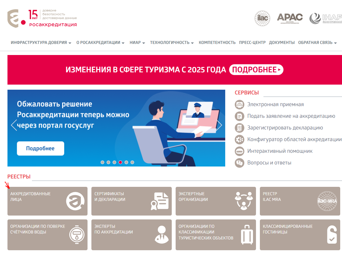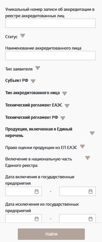 Реестр поддерживает расширенную фильтрацию: по субъекту РФ, типу аккредитованного лица. Фильтры удобны, когда нужно подобрать аккредитованную лабораторию в конкретном регионе под определенный вид испытаний.